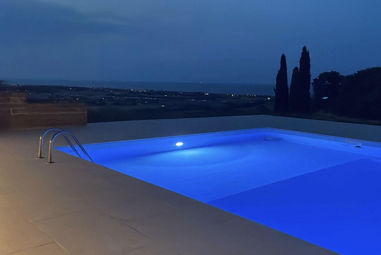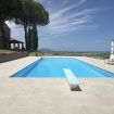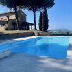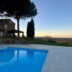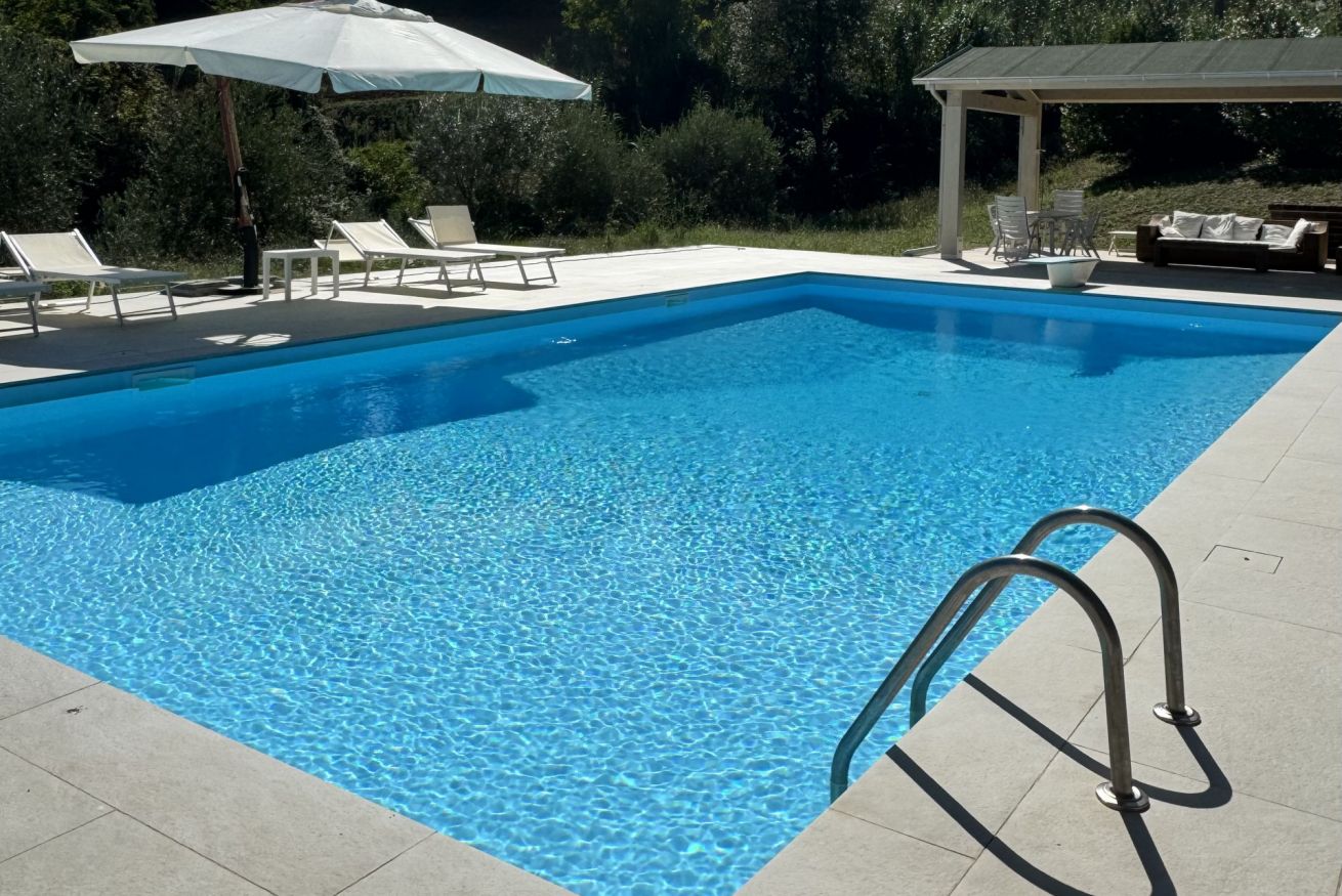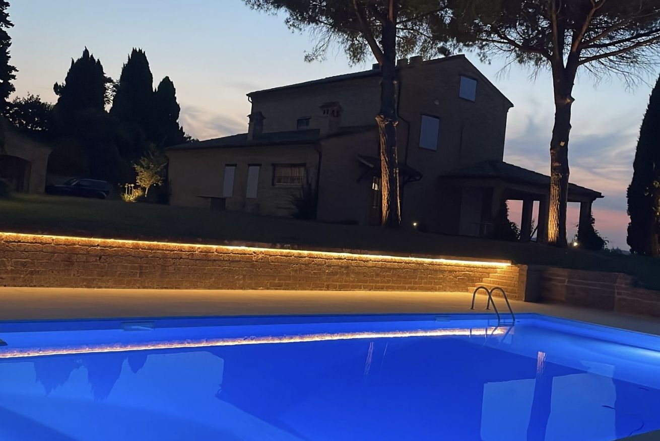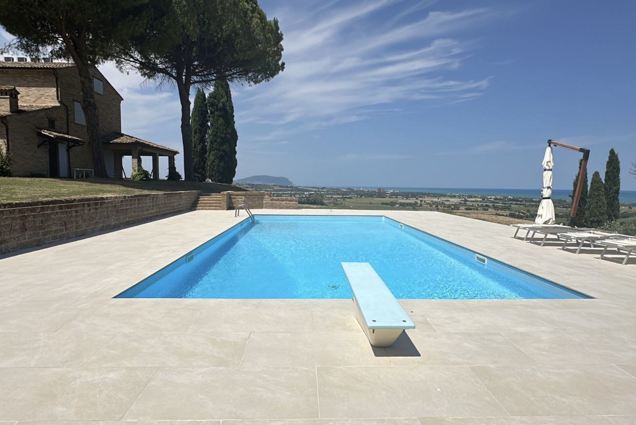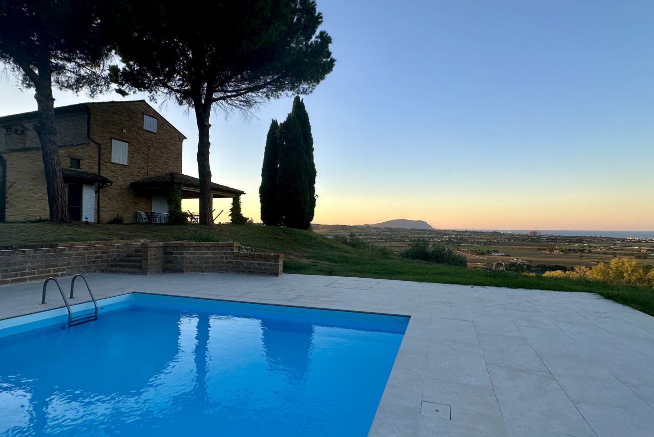 La proprietà è circondata da un ampio giardino curato, con un viale d’accesso indipendente che conduce all’ingresso principale e a un comodo garage privato. Al centro del giardino si trova la grande piscina panoramica, perfetta per rilassarsi ammirando i colori e i profumi della campagna marchigiana.