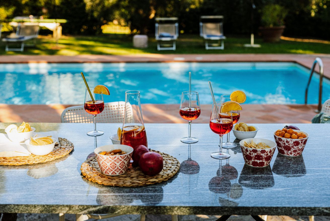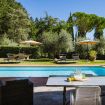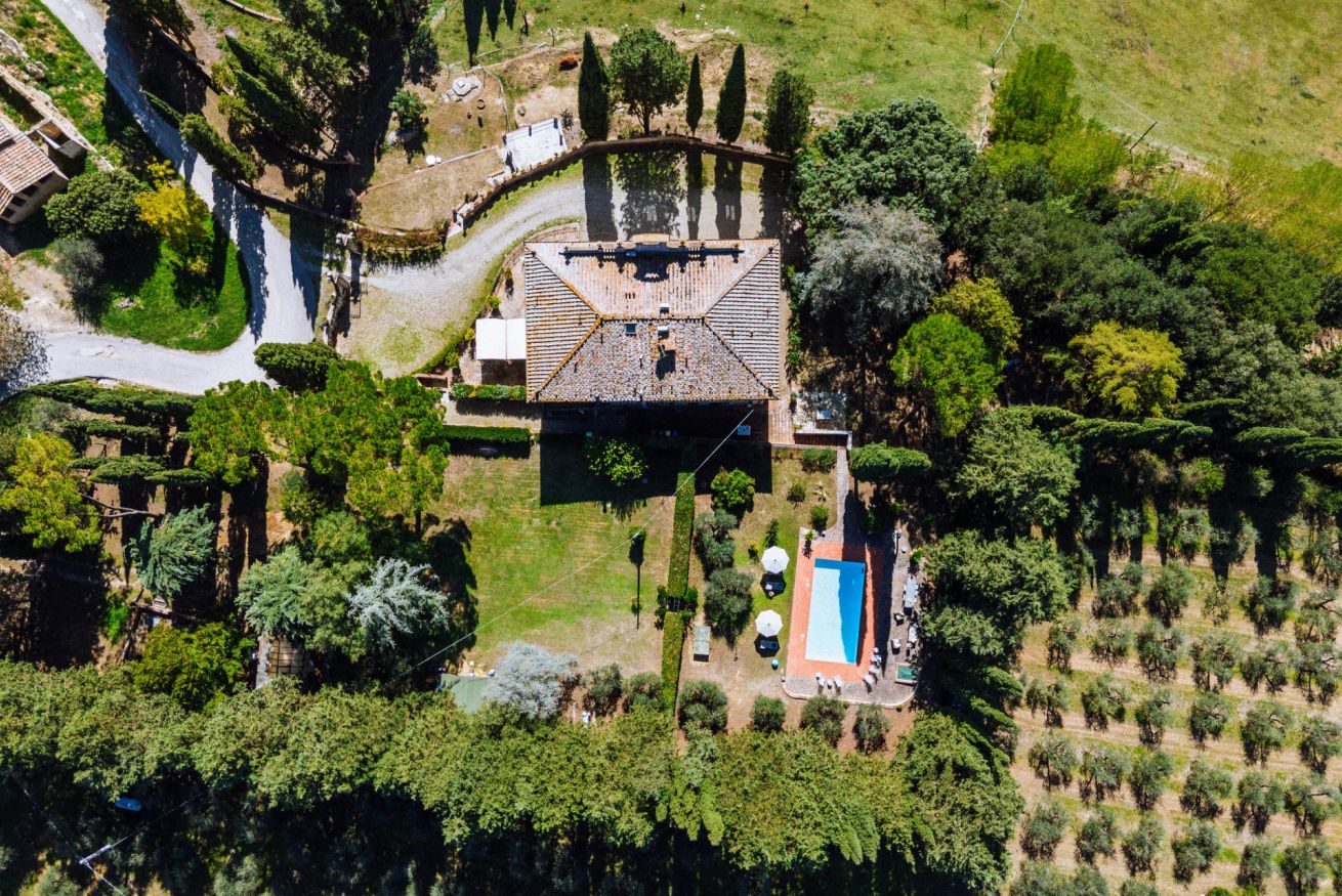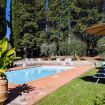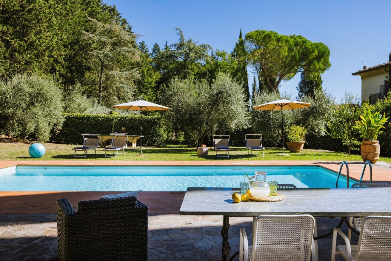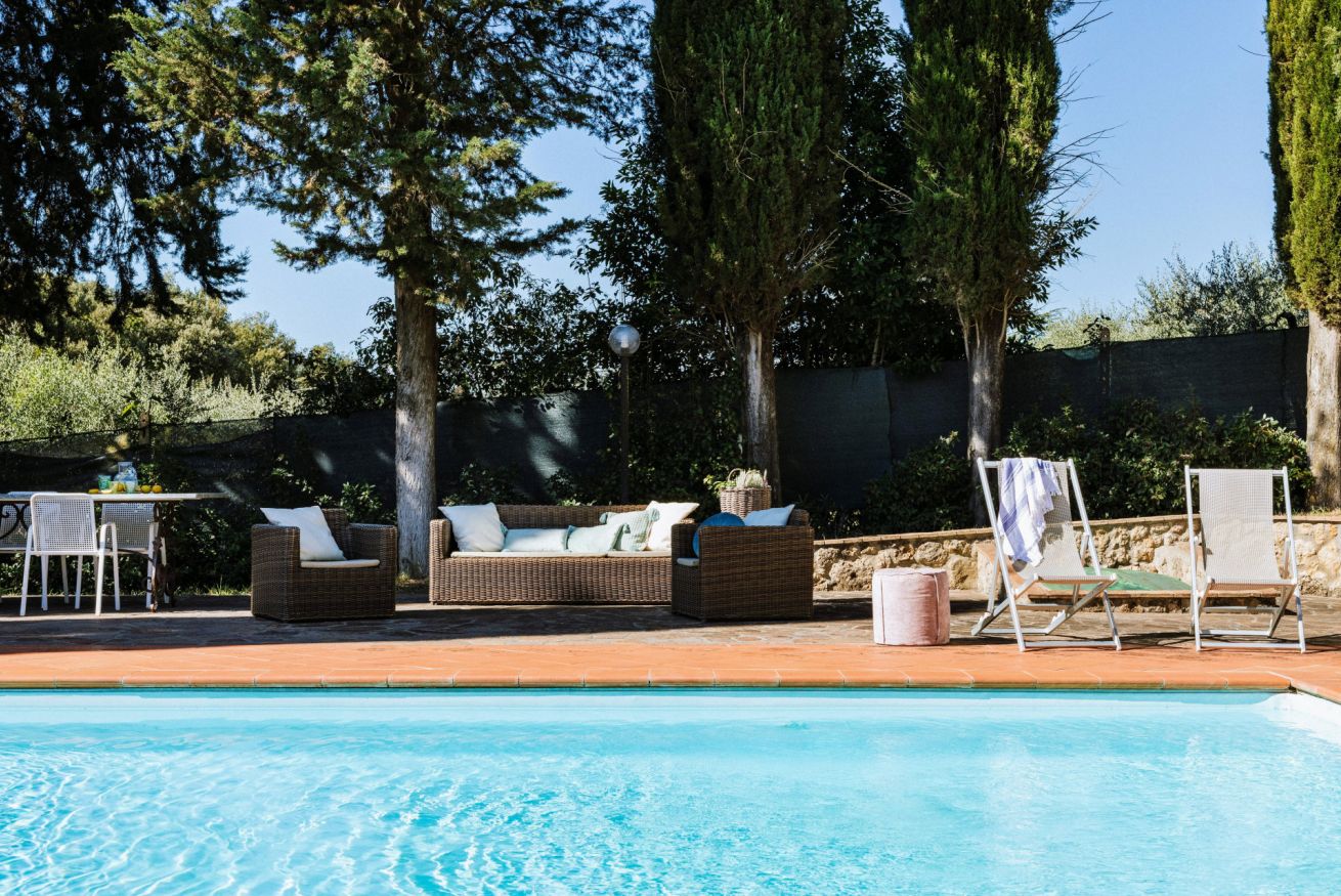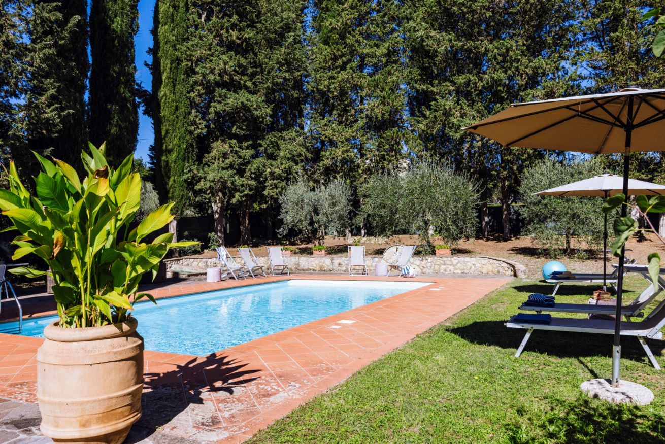 All’esterno, la villa è circondata da cipressi e ulivi e dispone di una piscina privata non riscaldata, indicativamente aperta da maggio a ottobre, accessibile dal retro della proprietà. L’area solarium, attrezzata con lettini e ombrelloni, è ideale per rilassarsi immersi nel silenzio e nel paesaggio del Chianti.