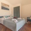Dal patio possiamo andare fino al tetto, dove la vista spazia dalla Corsica ad Asinara, oppure accedere all'accogliente doppio soggiorno con seconda zona pranzo, camino e tv. Ai lati del soggiorno troviamo le due camere matrimoniali, entrambe con bagni privati e l’immancabile vista mare. È disponibile anche una terza camera da letto, con un letto matrimoniale e bagno privato.