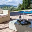Dalla sala da pranzo si esce direttamente sul giardino di 10.000 mq, in cui la grande piscina riflette il verde della fitta vegetazione da cui è circondata.