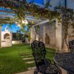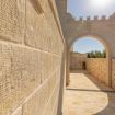 L’architettura di questa villa fonde le caratteristiche costruttive delle masserie a uno stile arabeggiante, con i muri di pietra chiara e i grandi archi che ti invogliano a salire la scala e ad entrare nella loggia.